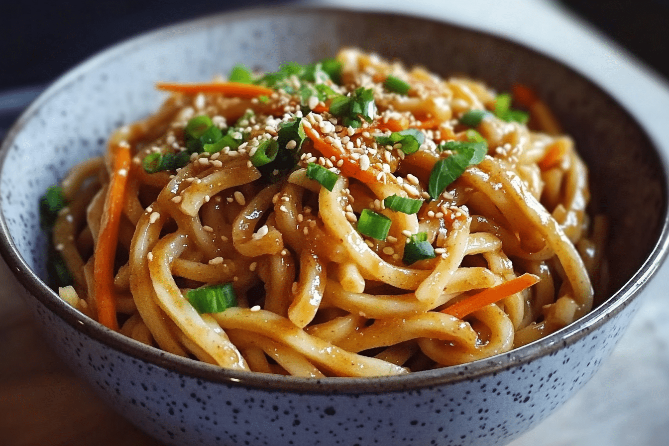 A quick and easy recipe for delicious peanut butter udon noodles that can be made in just 15 minutes.