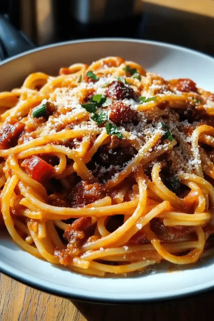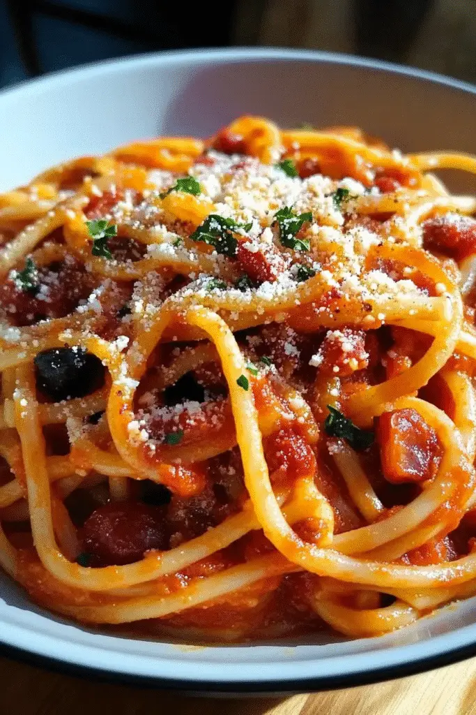 What makes this dish truly special is its ability to bring together simple ingredients—like garlic, onions, and tomatoes—into a harmonious blend of flavors. The addition of red pepper flakes adds a delightful kick, transforming a classic pasta dish into something exciting and vibrant. It’s a perfect example of how global influences can create a meal that feels both familiar and adventurous.