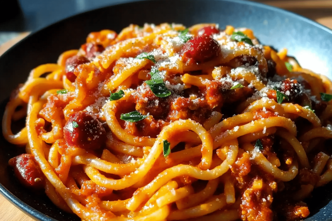 What makes this dish truly special is its ability to bring together simple ingredients—like garlic, onions, and tomatoes—into a harmonious blend of flavors. The addition of red pepper flakes adds a delightful kick, transforming a classic pasta dish into something exciting and vibrant. It’s a perfect example of how global influences can create a meal that feels both familiar and adventurous.