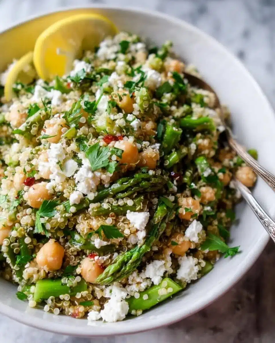 A fresh and vibrant salad featuring roasted asparagus, chickpeas, and quinoa, topped with creamy feta cheese and zesty lemon juice.