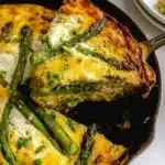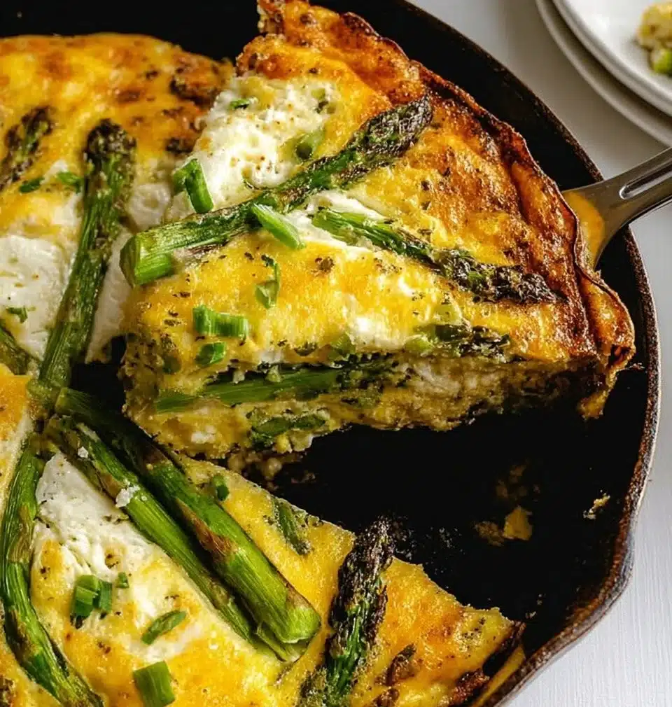 A delightful Asparagus Frittata featuring creamy eggs, tender asparagus, and crumbled cheese, perfect for any meal.