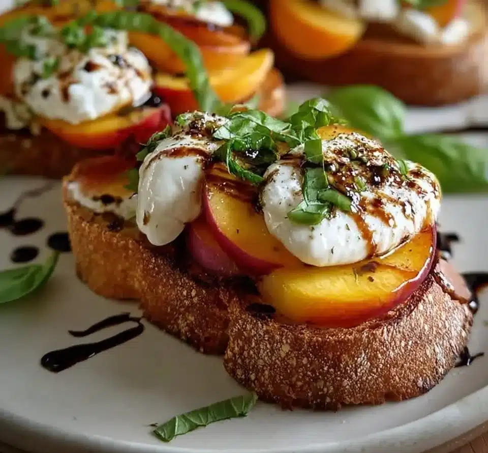 A delightful appetizer that combines juicy peaches, creamy burrata cheese, and a tangy balsamic glaze, served on crusty bread.