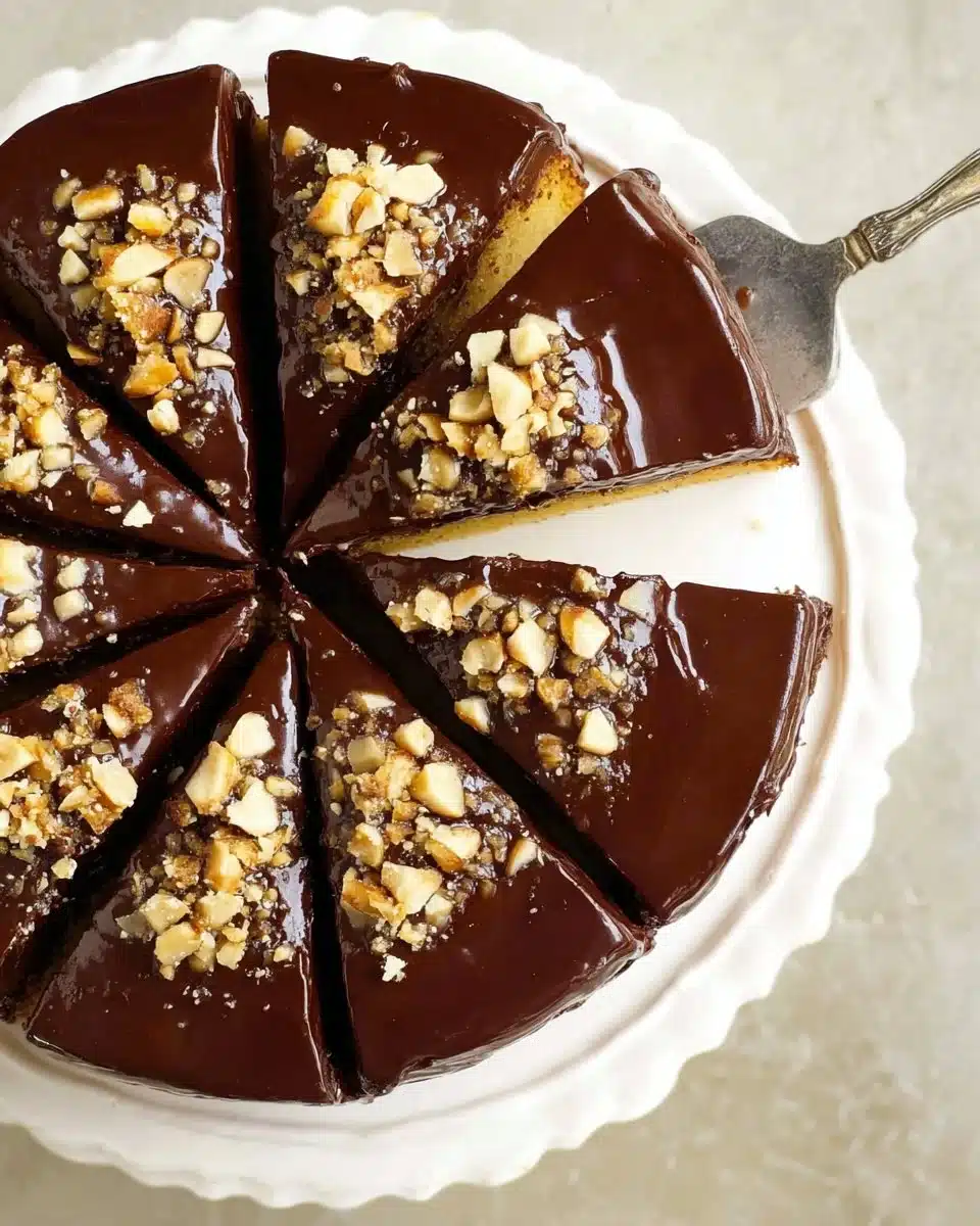 - Allow the ganache to firm up a bit before carefully transferring the cake to a plate for serving.