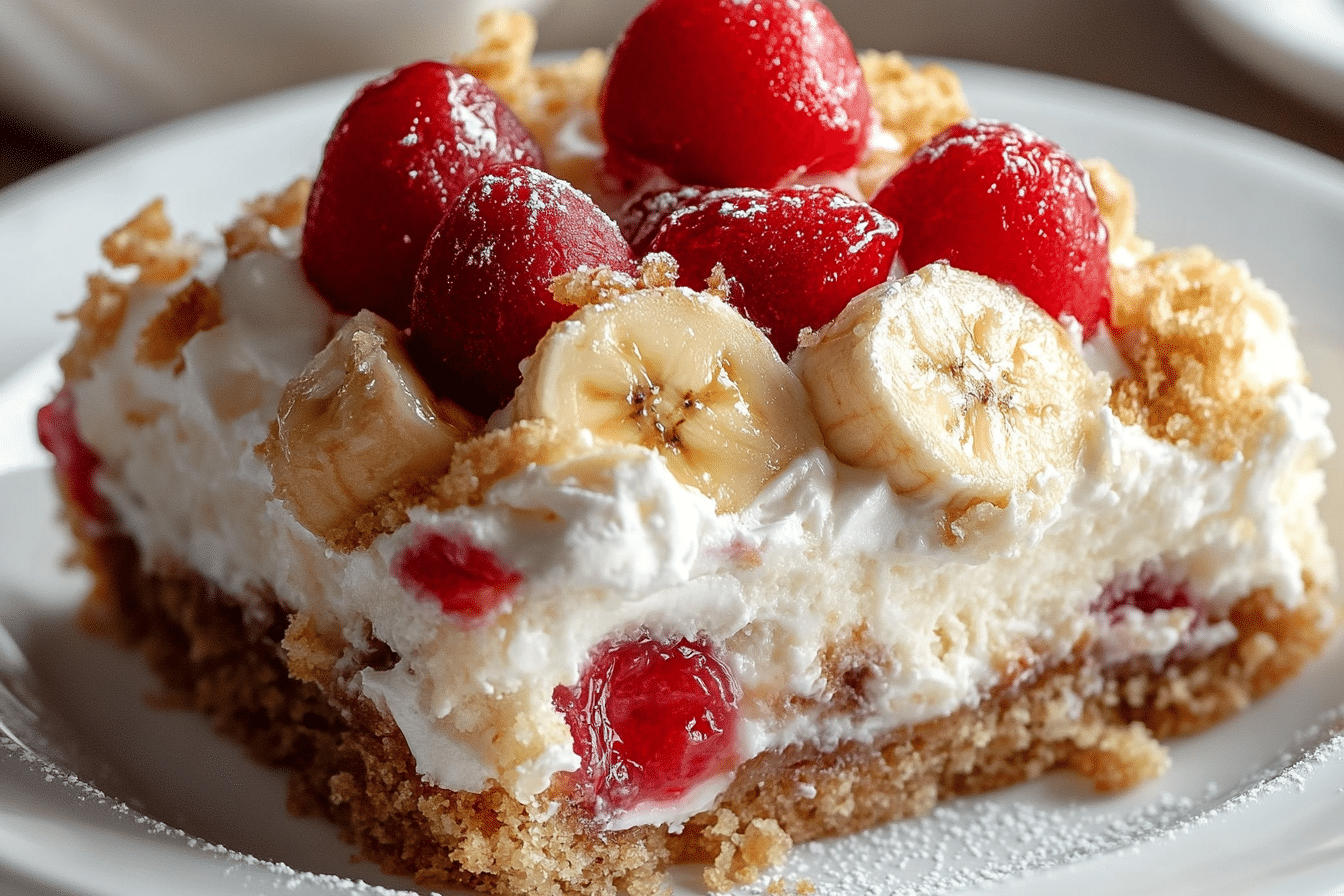 - In a greased 9×13 inch baking dish, layer the sliced bananas, crushed pineapple, maraschino cherries, and chopped nuts.