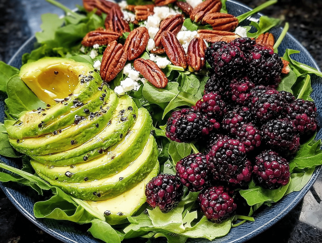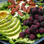 A refreshing salad featuring blackberries and avocados, drizzled with a tangy honey lemon vinaigrette.