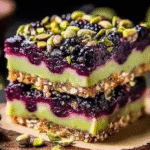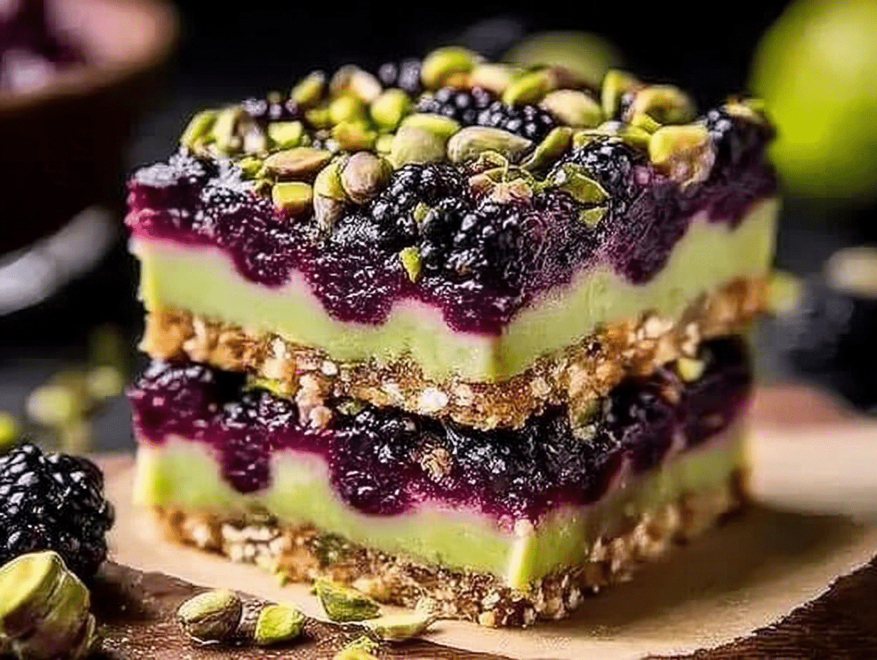 Delicious and creamy bars made with blackberries and pistachios, perfect for dessert lovers.