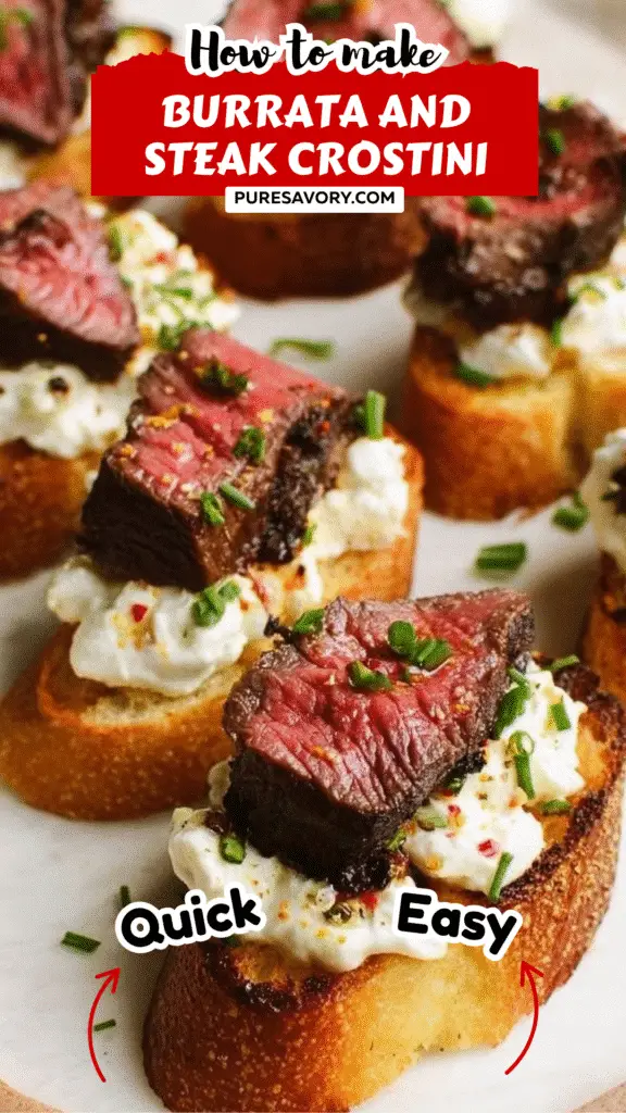 Keywords: Burrata and Steak Crostini, Braised Beef Appetizer, Mini Steak Appetizers, Prime Rib Appetizer, Beef Appetizers Easy, Steak Charcuterie Board Ideas, Beef Appetizers Fancy, Steak Bruschetta, Crustini Appetizers Christmas, Beef Crostini Appetizers