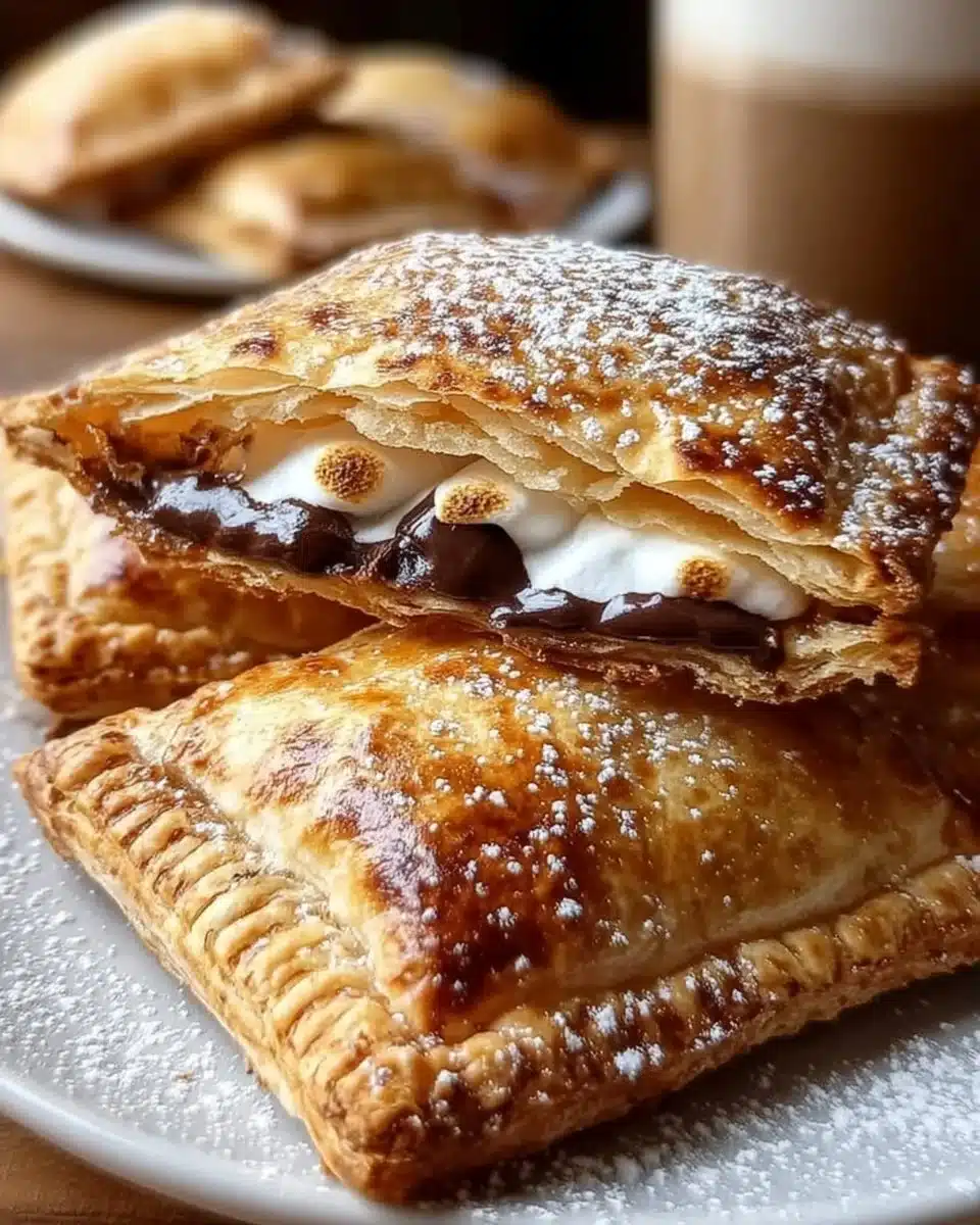 Delightful hand pies filled with chocolate, marshmallows, and graham crackers, reminiscent of classic s’mores.