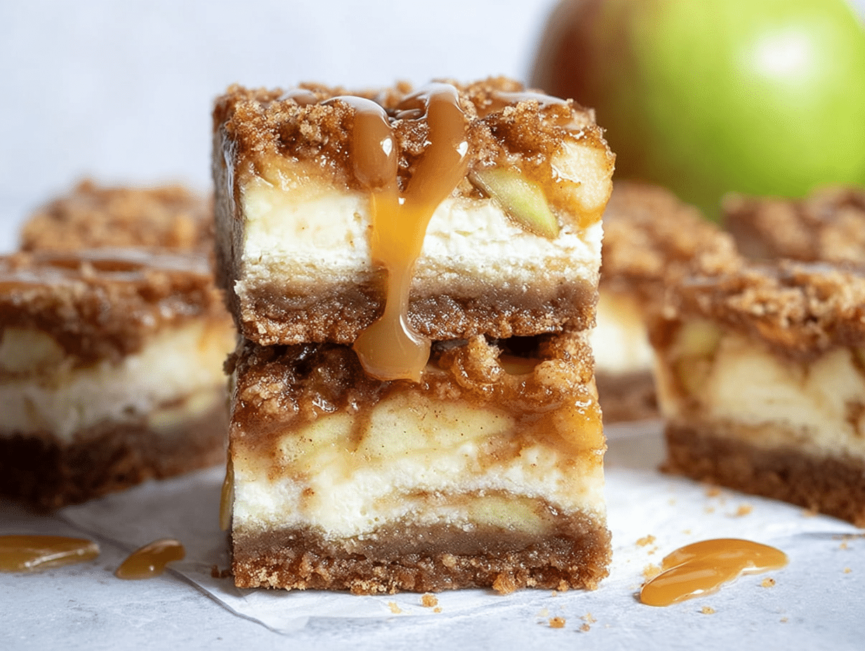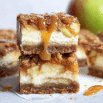 Deliciously creamy cheesecake bars topped with caramel and apple slices, perfect for dessert lovers.