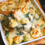 A delightful dinner recipe perfect for couples, featuring cheesy chicken and tortellini baked to perfection.