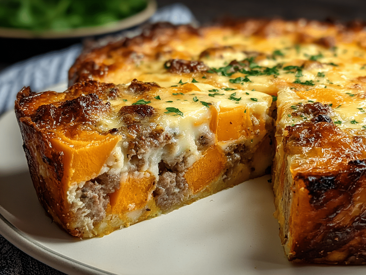 A delicious and hearty quiche made with sweet potatoes, ground turkey, and cheese, perfect for any meal.