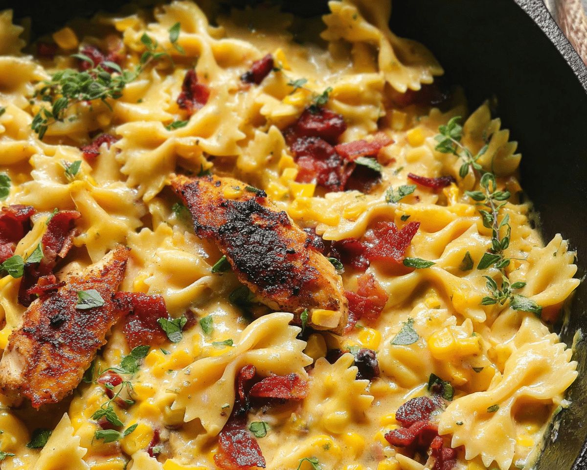 At its core, this pasta dish combines tender chicken, sweet corn, and crispy bacon, all enveloped in a comforting pasta base. The flavors are reminiscent of classic American fare, where hearty ingredients are celebrated. It’s a dish that not only fills the stomach but also warms the heart, making it a staple for family dinners and gatherings.