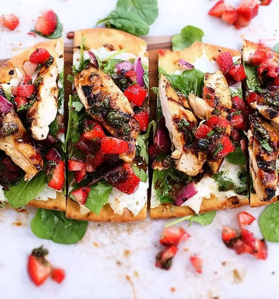 There’s something magical about the sizzle of chicken on a grill, the sweet perfume of strawberries, and the vibrant colors of fresh greens all coming together in one dish. This Grilled Balsamic Chicken Salad Pizza with Fresh Strawberry Salsa is not just a recipe; it’s a celebration on your plate, bursting with flavors that dance and mingle like old friends reuniting after years apart.