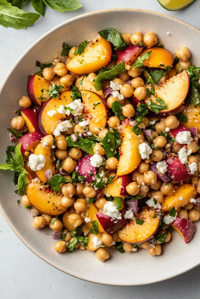 A refreshing summer salad combining chickpeas and peaches with a zesty honey lime dressing.