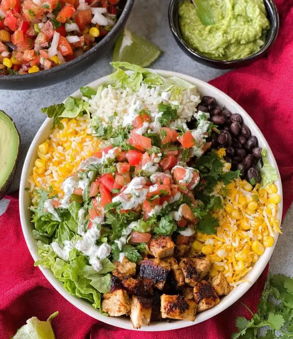 A vibrant and delicious Chipotle Burrito Bowl packed with seasoned chicken, fresh veggies, and creamy guacamole, perfect for busy weeknights or gatherings.