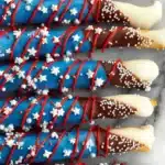 - Drizzle red lines over the white area (not covered in blue) of the pretzel rod.