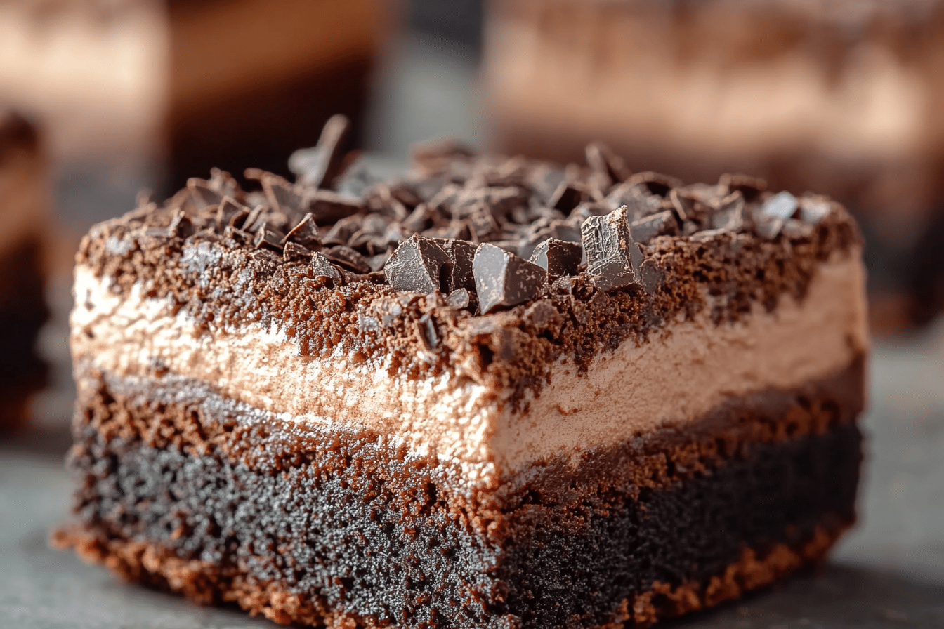 A rich and indulgent dessert combining the flavors of chocolate mousse and brownies.