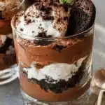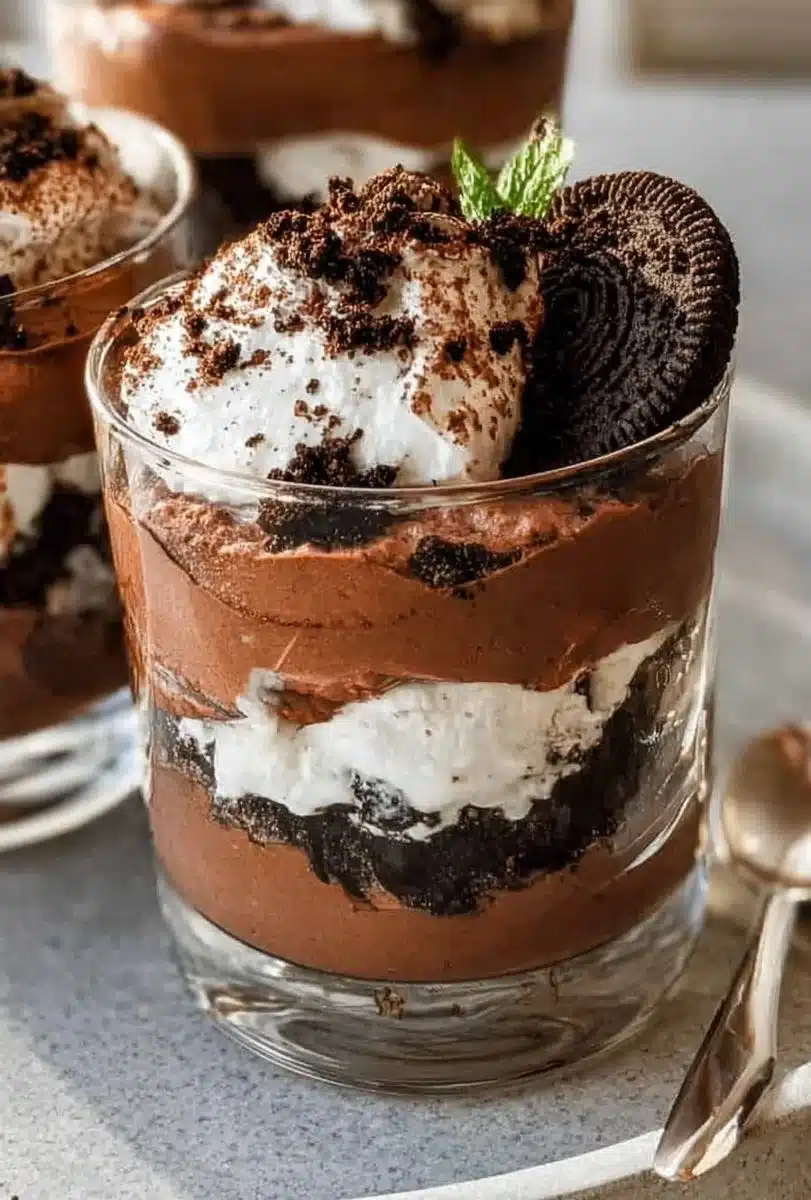 A delightful layered dessert combining rich chocolate mousse, whipped cream, and crunchy cookie crumbs for a perfect sweet treat.