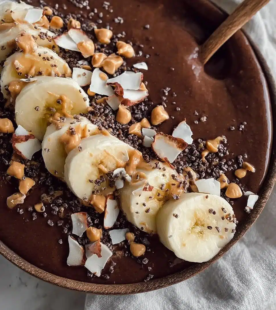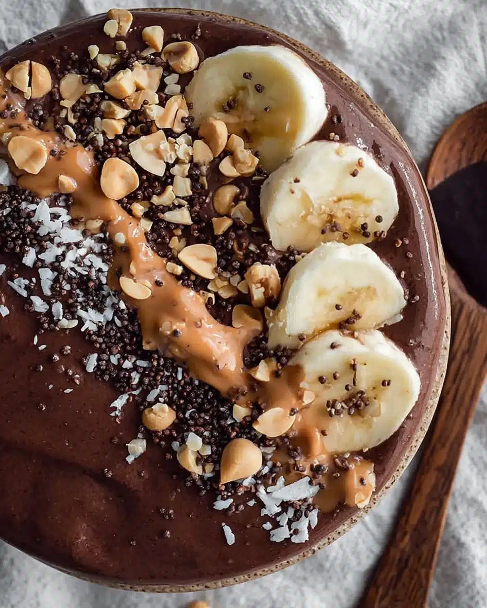 A delicious and nutritious smoothie bowl featuring a rich combination of chocolate and peanut butter, perfect for breakfast or a midday treat.