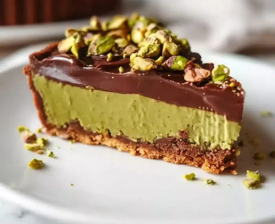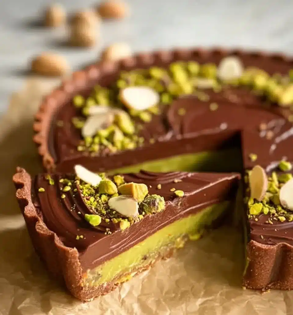 A delicious tart combining rich chocolate ganache and nutty pistachio cream, perfect for any occasion.