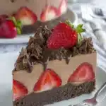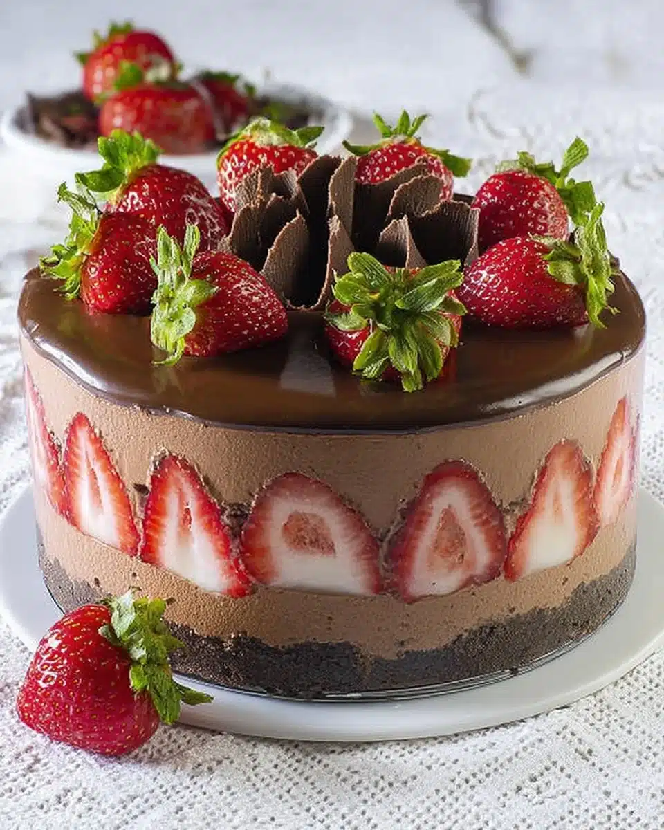 A delightful dessert combining rich chocolate cake, airy strawberry mousse, and fresh strawberries, perfect for celebrating Mother’s Day.