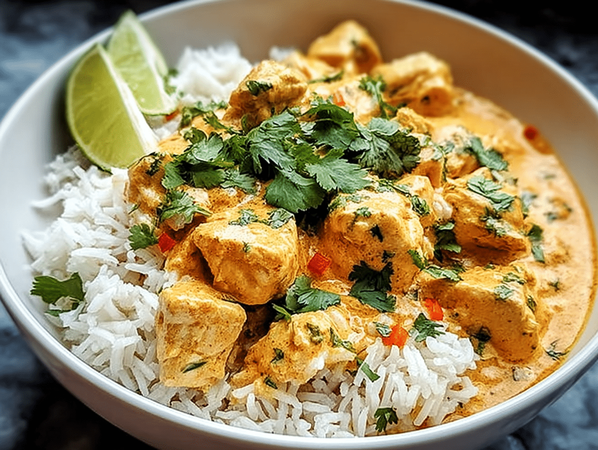 A delicious and creamy coconut chicken served over fluffy rice, perfect for a comforting meal.