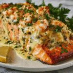 Crab and Shrimp Stuffed Salmon is a delightful seafood dish that combines tender salmon fillets with a savory stuffing of crab and shrimp. This dish is a true celebration of the ocean’s bounty, bringing together the rich flavors of the sea in a way that is both comforting and elegant. The creamy filling, enhanced with fresh herbs and spices, creates a perfect harmony with the flaky salmon, making each bite a delicious experience.