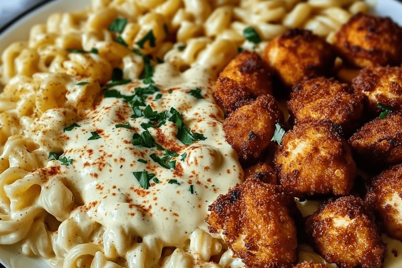 Why You’ll Love This Crispy Chicken Bites over Spiced Alfredo Pasta