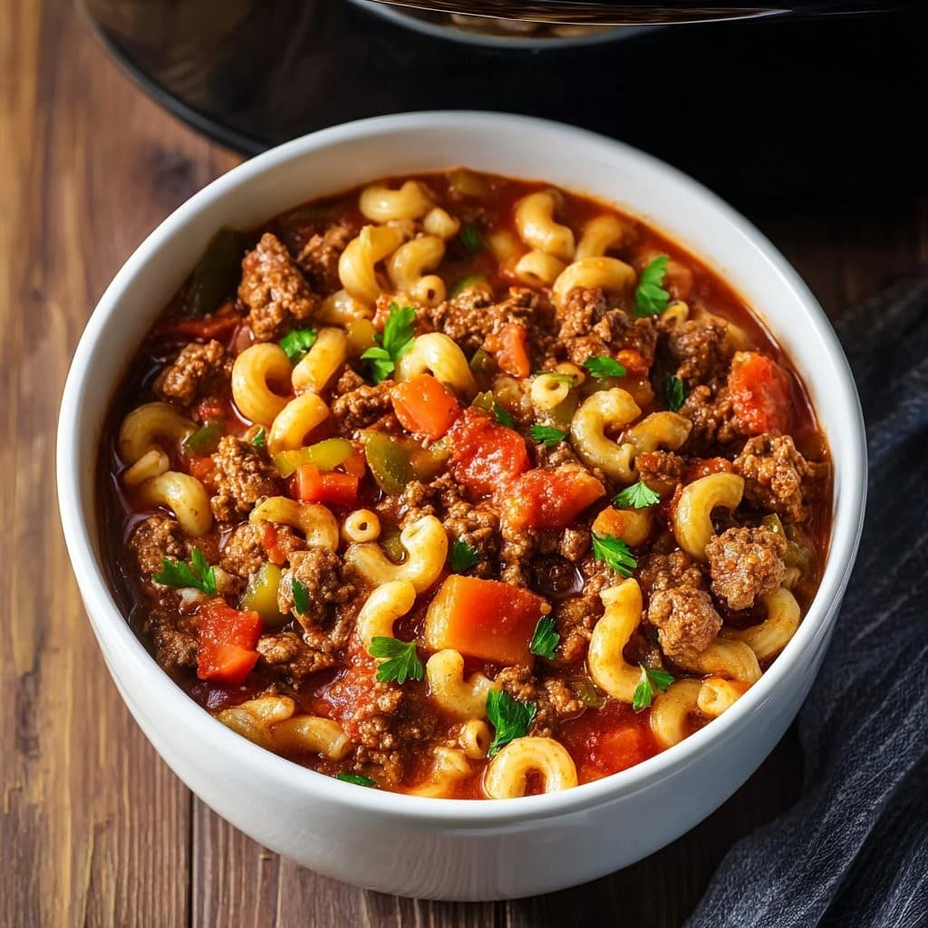 A hearty and easy-to-make American Goulash recipe cooked in a crock pot, perfect for busy days.