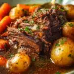 A comforting and hearty slow-cooked dish featuring tender chuck roast with fresh vegetables.