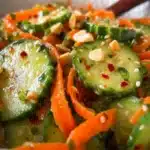 A refreshing and vibrant salad featuring crunchy cucumbers and carrots, enhanced with a flavorful dressing.