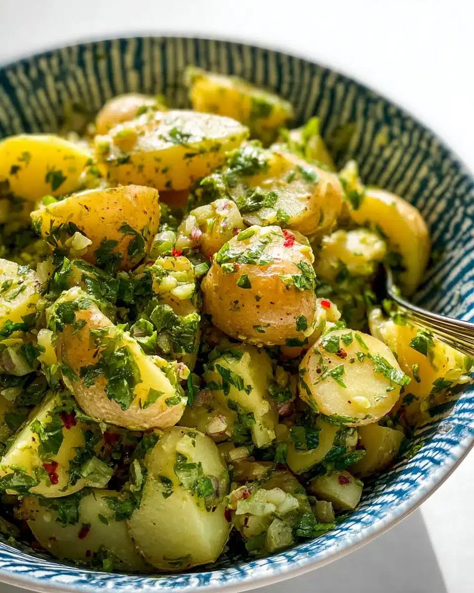 A vibrant potato salad featuring tender potatoes, fresh leeks, and herbs, perfect for family gatherings and summer picnics.