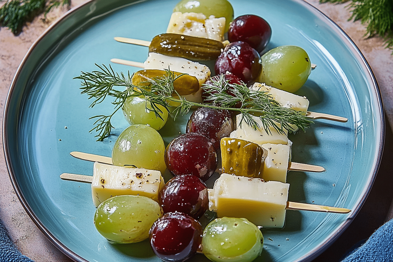 A unique and refreshing snack combining the tangy flavor of dill pickles with sweet California grapes and creamy cheese.
