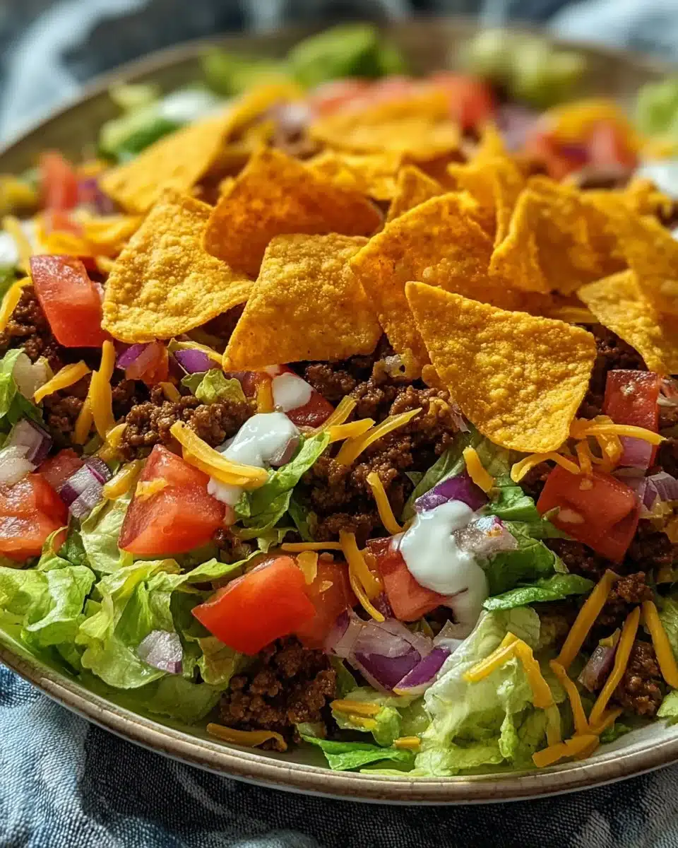A delightful salad combining seasoned ground beef, fresh lettuce, tomatoes, and crunchy Doritos, perfect for weeknight dinners and gatherings.