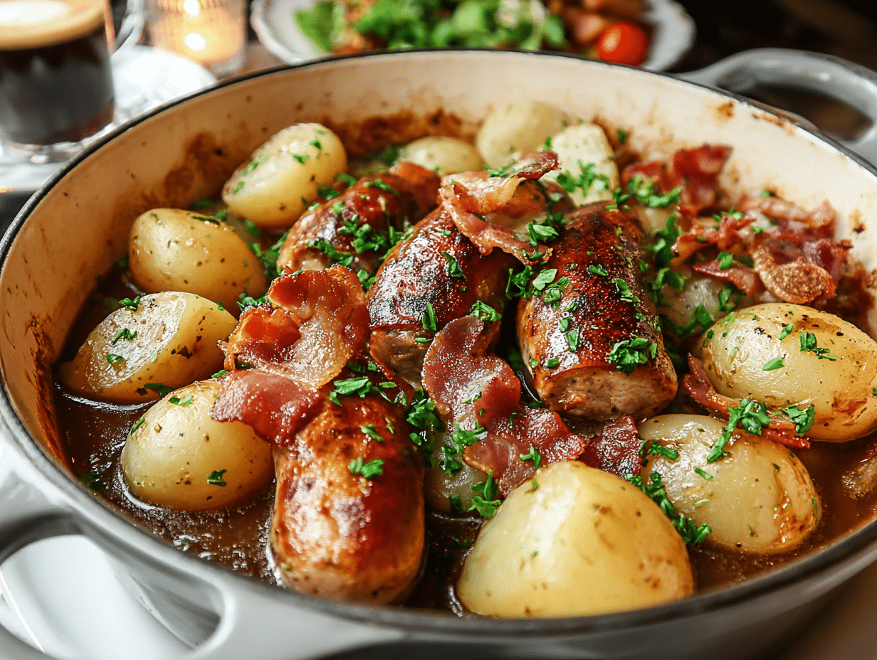 Dublin Coddle is a hearty Irish stew made with sausages, bacon, potatoes, and onions, perfect for a comforting meal.