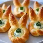 Delightful crescent bites filled with creamy spinach-artichoke dip and cheese, shaped like bunnies for a fun Easter treat.