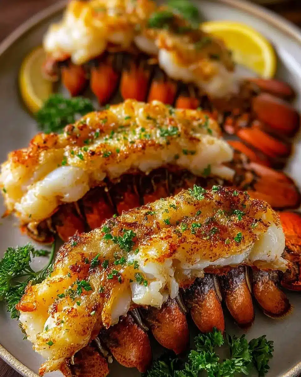 A luxurious dish featuring tender lobster tails broiled with a rich garlic butter sauce, perfect for special occasions and celebrations.