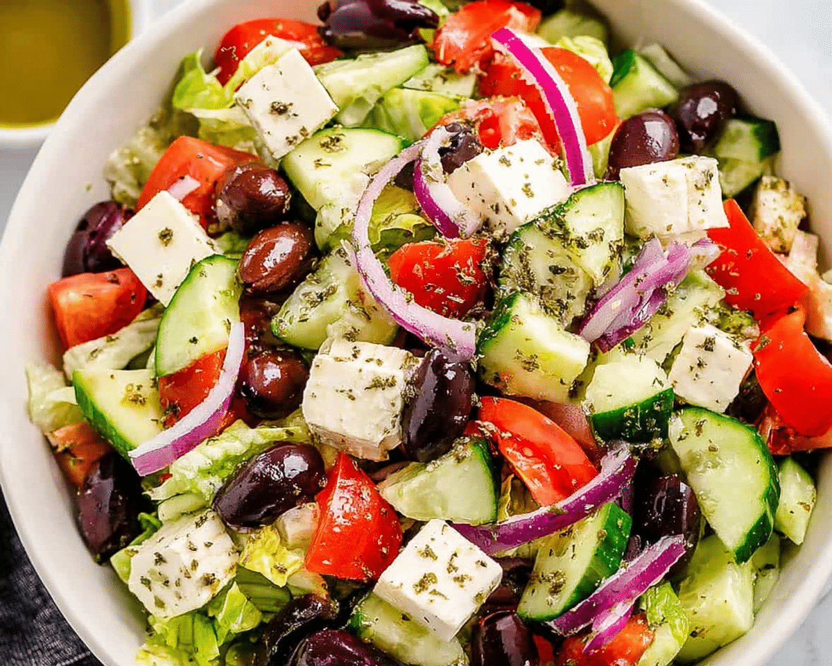 A refreshing and healthy Greek salad perfect for spring, featuring fresh vegetables and feta cheese.