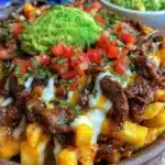 - Assemble the Loaded Carne Asada Fries: Once fries are done, transfer them to a large serving platter or keep on the baking sheet. Evenly scatter the sliced carne asada over the fries. Sprinkle shredded cheese generously over steak and fries while still hot, so it melts nicely. Top with dollops of sour cream, guacamole, and pico de gallo. Garnish with fresh cilantro, green onions, and jalapeño slices if you like some heat. Serve: Finish with lime wedges on the side, letting everyone squeeze a bit of fresh citrus over the top for that bright pop of flavor.