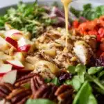 A colorful, nutritious salad combining shredded chicken with mixed greens, vibrant vegetables, and a sweet yet tangy honey mustard dressing.