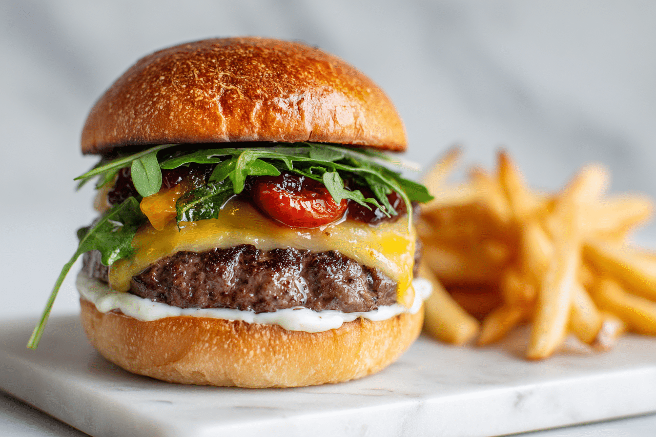 - Cook the Burgers: Form four patties. Season with salt and pepper. Sear on skillet or grill for ~4 minutes per side, adding cheese in final minute. Toast buns. Assemble with aioli, arugula, tomato, onion, burger, and Drip Jam.