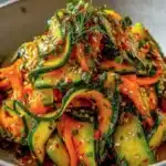 The Korean Cucumber Carrot Salad is a staple side dish known as “Oi Muchim.” This recipe showcases the freshness of summer vegetables, often enjoyed at family meals, picnics, or even during celebrations. It’s a lovely reminder of the bold flavors of Korean cuisine combined with the simplicity of fresh ingredients. The use of gochugaru provides a gentle heat that awakens the palate, while the sesame seeds add an earthy crunch that complements the crisp, garden-fresh veggies.
