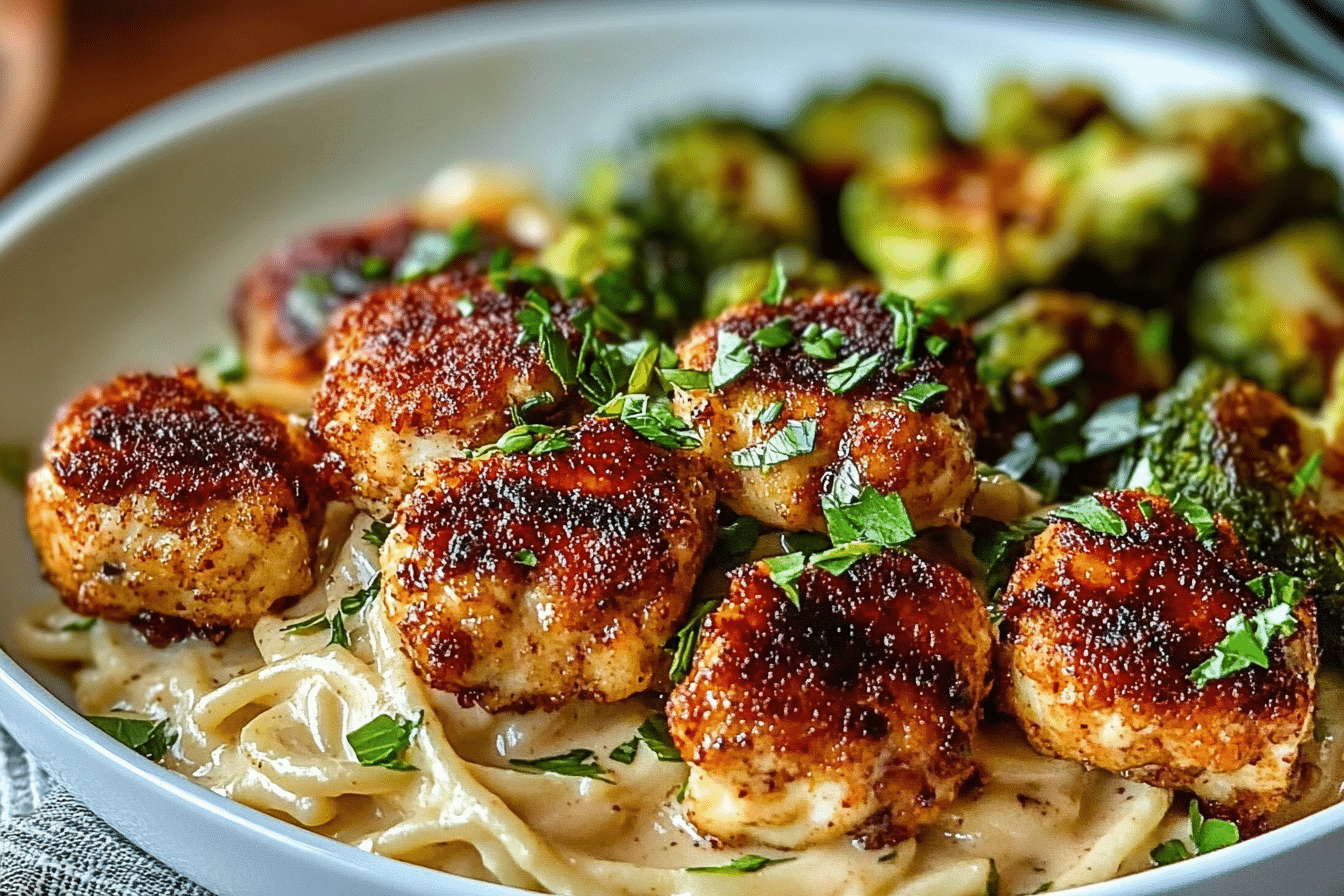 Why You’ll Love This Maple Chicken Bites with Spiced Alfredo and Crispy Brussels