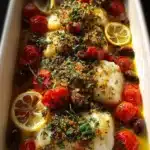 A delightful dish of baked cod infused with vibrant Mediterranean flavors from olives, tomatoes, and lemon.