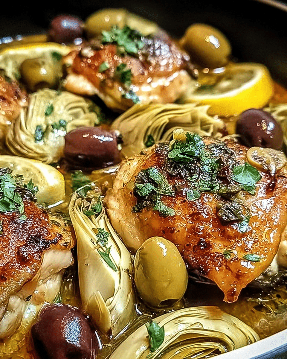 A flavorful Mediterranean dish featuring tender chicken, artichokes, and olives, perfect for a healthy dinner.