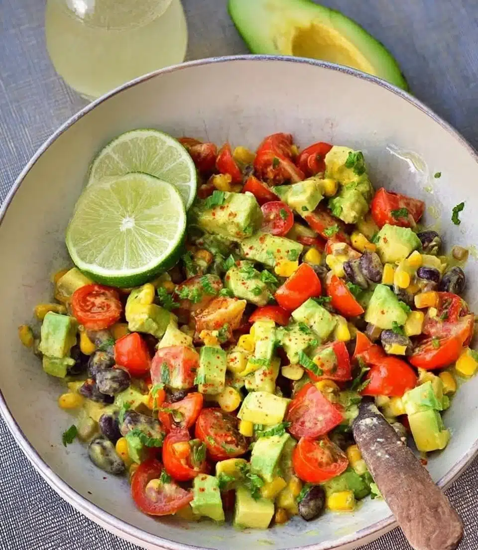 A vibrant and nutritious salad featuring creamy avocados, black beans, and fresh vegetables, dressed with lime and cilantro.