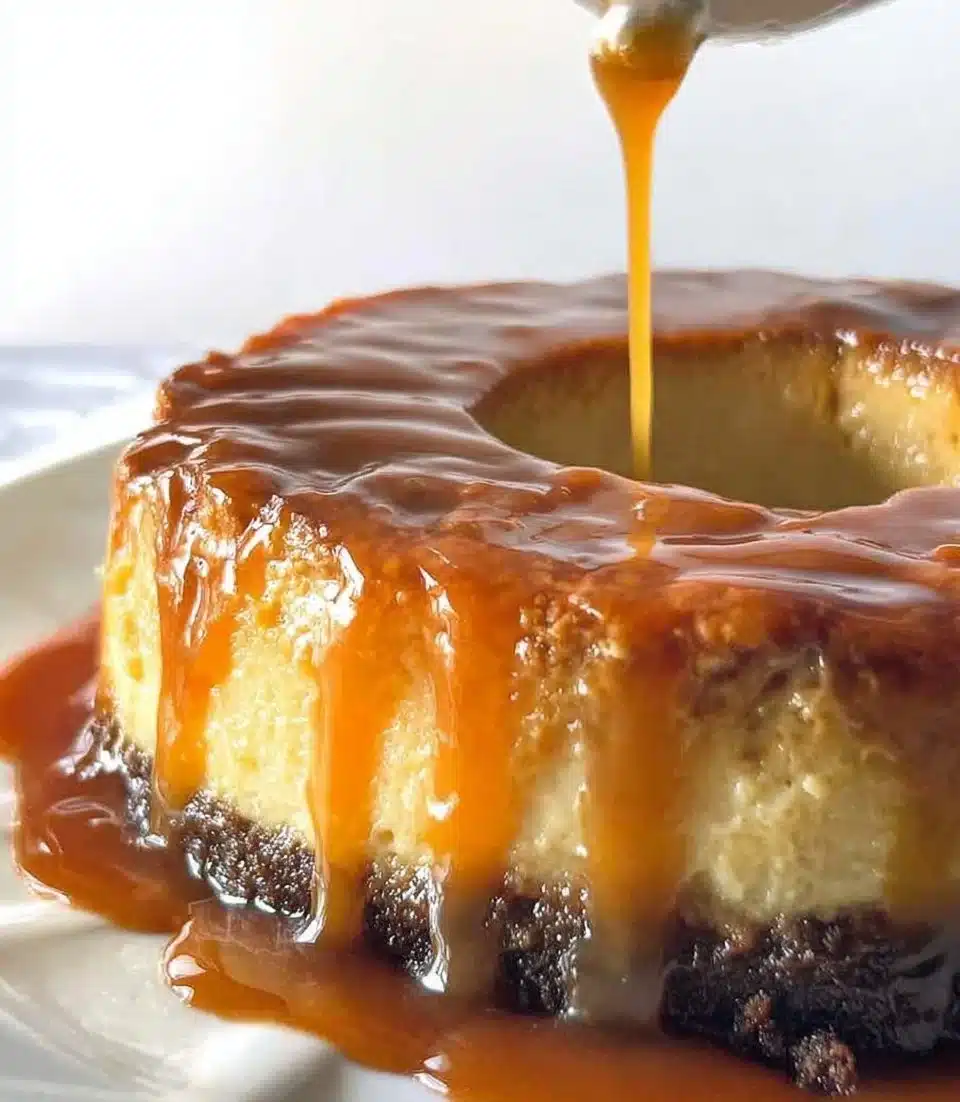 - Prepare the caramel by combining sugar and water in a saucepan over medium heat. Stir until sugar dissolves and turns golden brown. Quickly pour into the bottom of a bundt pan.