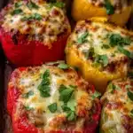 Flavorful bell peppers filled with ground beef, black beans, and corn, baked to perfection.