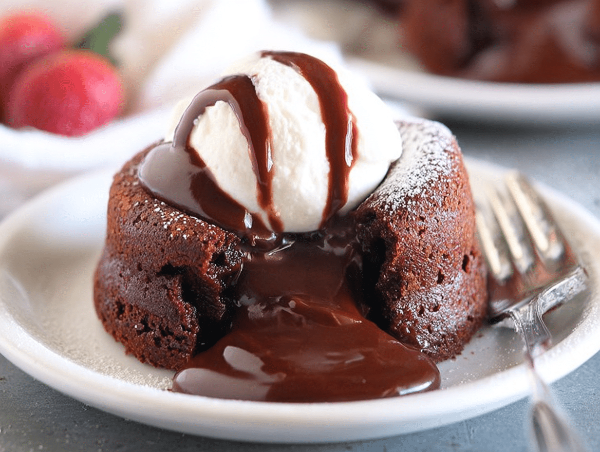 A rich and decadent molten chocolate cake with a gooey center that melts in your mouth.