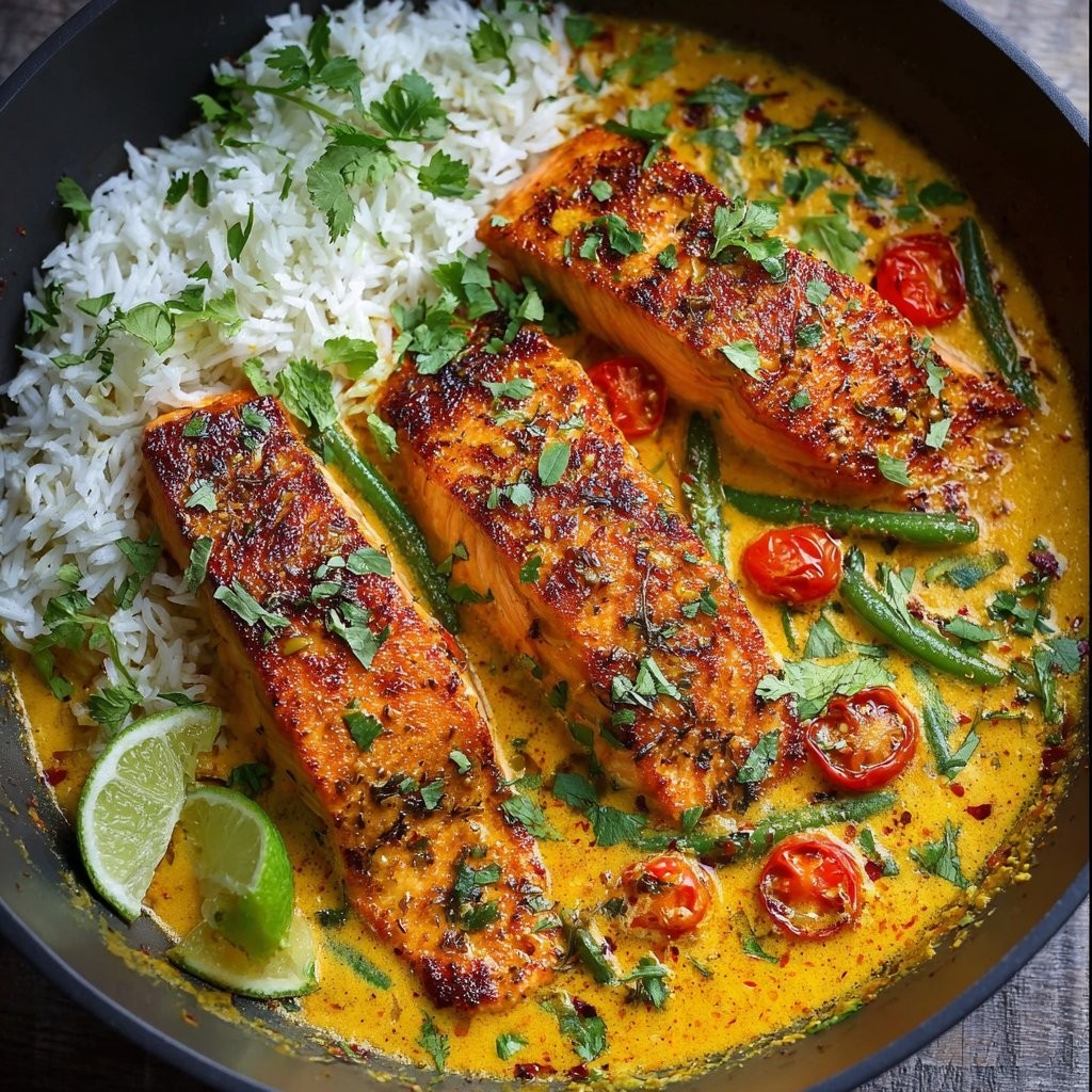 A delicious and easy recipe for dinner that combines salmon with a rich coconut curry sauce, all made in one pan.